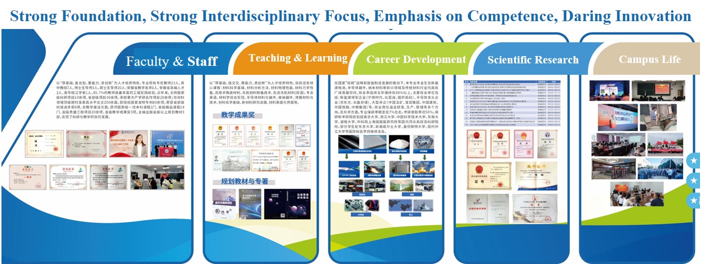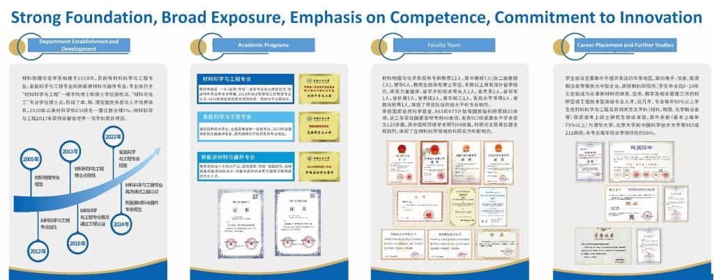 The Department of Materials Physics and Chemistry was founded in 2008. At present, it has the major of Materials Science and Engineering. Based on the first-class discipline award, the department consists of undergraduate, master and doctoral degree programs. The Materials Science and Engineering major has successfully passed the Engineering Education Professional Certification of the Ministry of Education in 2018, and our major has further won the national first-class major construction qualification in 2019.