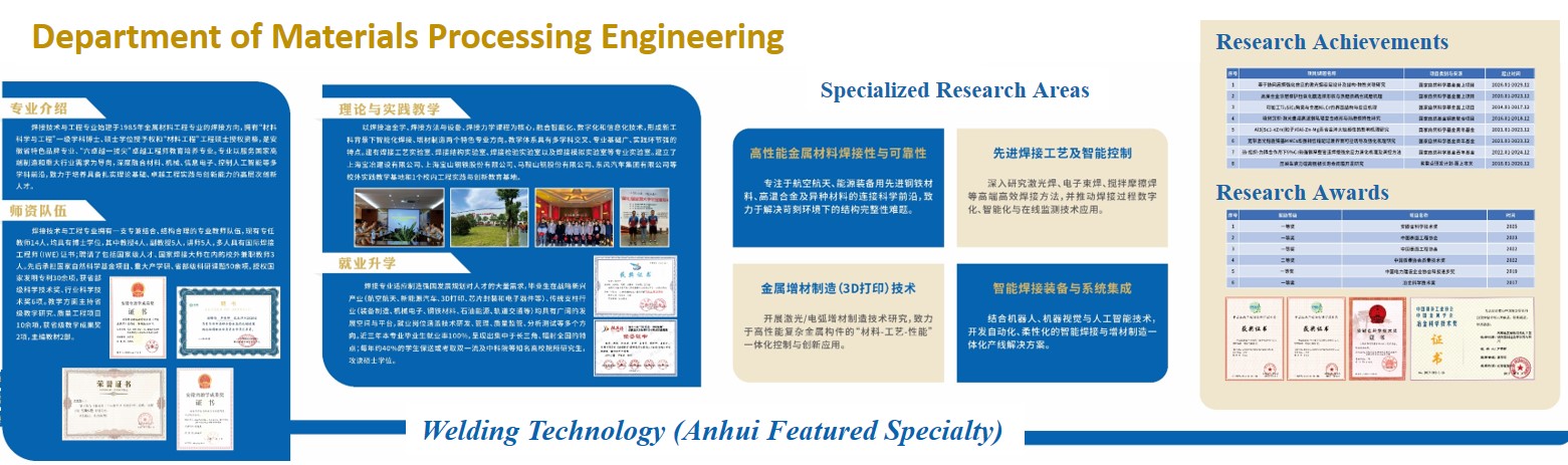 The Department of Material Processing Engineering was founded in 1985 as the welding branch of metal material engineering. It has doctoral and master programs as well as the authorized qualification of "Material Engineering" professional master. At present, the department has 13 full-time academic staff with doctor degree, including 2 Professor, 5 Associate Professors, 9 Master's supervisors, and many of them have international welding engineer certificate (IWE).