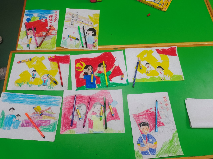 课堂中,实践队员解读了中华人民共和国国旗、共产党党旗、共青团团旗、少先队队旗的由来及含义,阐释了红旗蕴含的重要意义:“红旗是革命先辈们用血染红的,先辈们为了中华民族而献出了自己的生命,红色是革命的胜利,是中华儿女的态度,是激情是拼搏是向上,是中国人民的代表色!”小朋友认真听讲,踊跃参与互动。宣讲之后小朋友们用绘画的方式展现对未来中国梦的愿景,大家充分发挥想象力,从勾勒线条到认真涂色,小朋友们通过执笔绘梦表达了对入队、入团、入党的美好期望,“红色种子”也如星星之火般燎原。