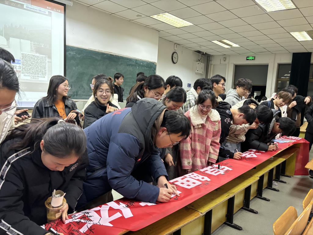 随后,辅导员王心雨就考研注意事项做了提醒,并就校园安全、防范诈骗、征兵工作、医保缴纳等工作做了部署。同学们在励志横幅上郑重签下自己的名字,表达了他们的决心:将以此次誓师大会为新的起点,进一步巩固考研的决心,完善复习策略,调整备考状态,以更加积极主动的姿态和满腔热忱迎接即将到来的研究生入学考试。 (撰稿:赵美男 审核:王心雨 汪盛颜)